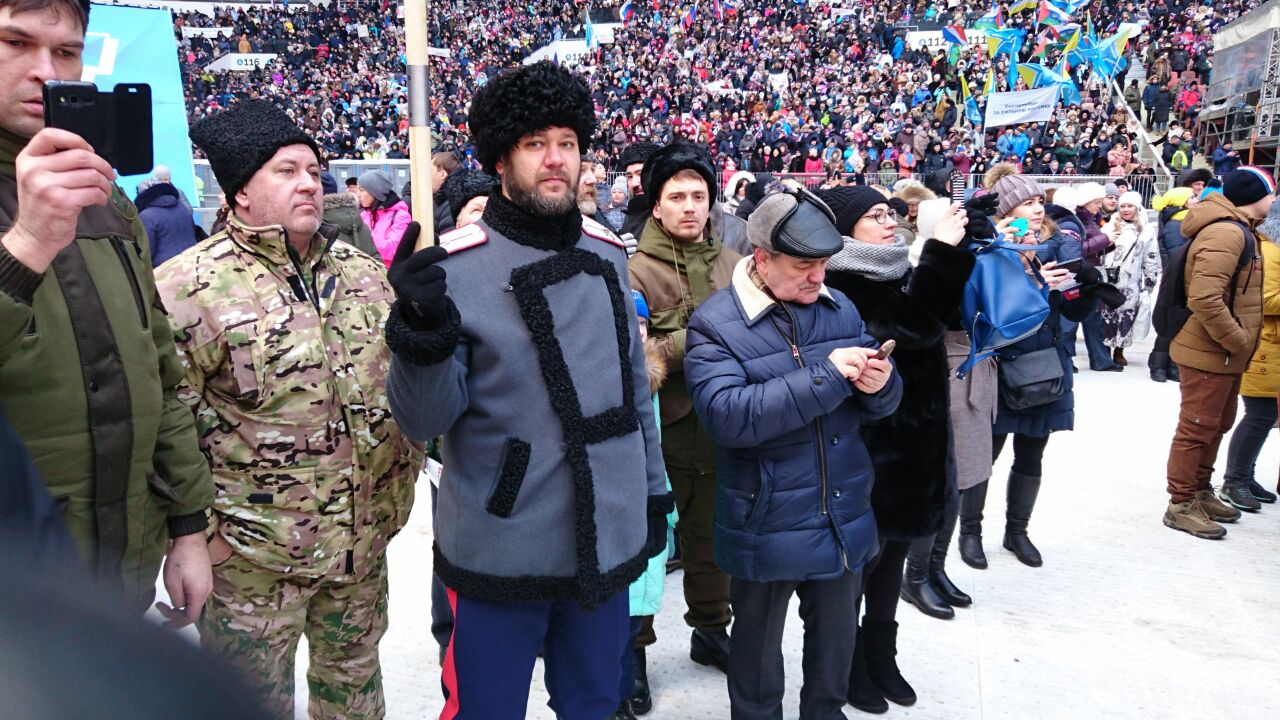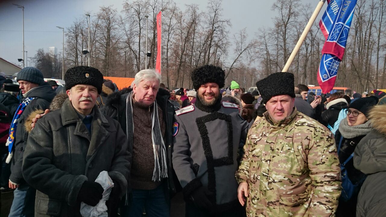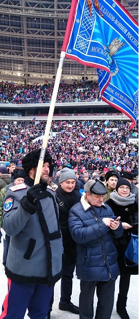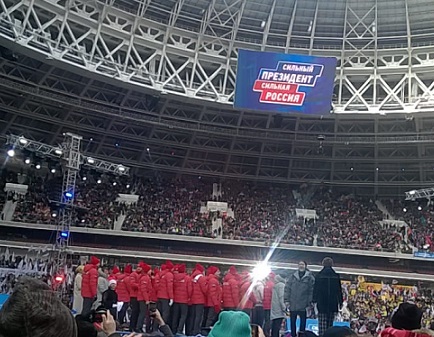 В начале весны, 3 марта 2018 года в спортивном комплексе "Лужники" в Москве прошел концерт-митинг "За сильную Россию" в поддержку кандидата в президенты Российской Федерации В.В. Путина. На него собрались около ста тысяч человек. Люди приехали со всей страны. Не исключением стали и Казаки Троицкой казачьей общины «Станица «Донская-Посольская», Казаки ХКО "Хорошево-Мневники" и Казаки хутора им.Я́кова Петро́вича Бакла́нова, в составе Московского Регионального отделения «СКВРиЗ», которые все цело поддерживаю действующего Президента. Кульминацией стало появление самого кандидата в президенты. Действующий глава государства выступил перед десятками тысяч сторонников. «Мы — команда! У нас ясные, понятные, благородные цели. Мы хотим сделать нашу страну яркой и устремлённой вперёд в будущее». Выборы главы государства намечены на 18 марта 2018 года. Казаки «Союза Казаков Воинов России и Зарубежья» призывают каждого прийти и сделать свой правильный выбор за сильную Россию!!!