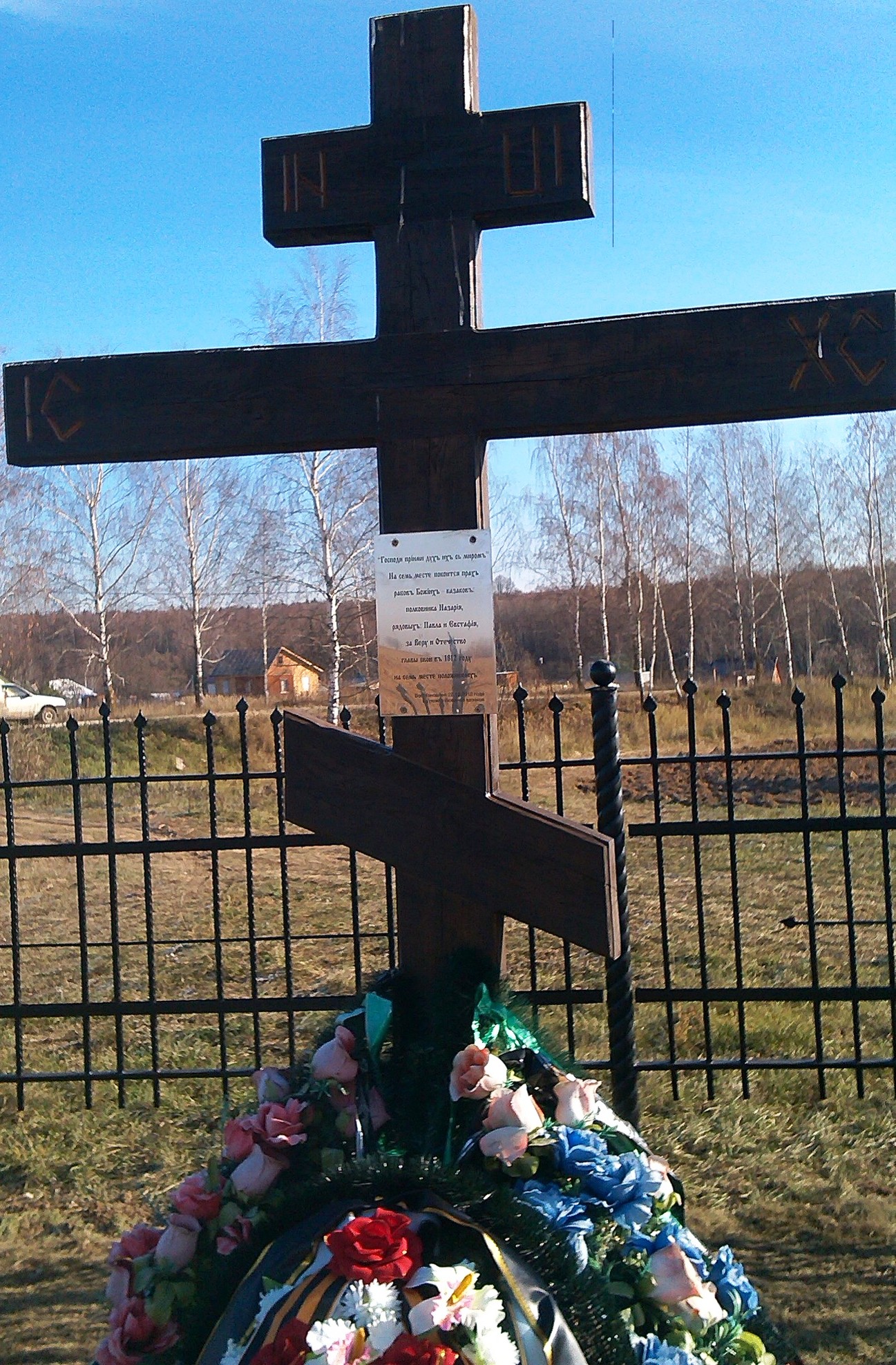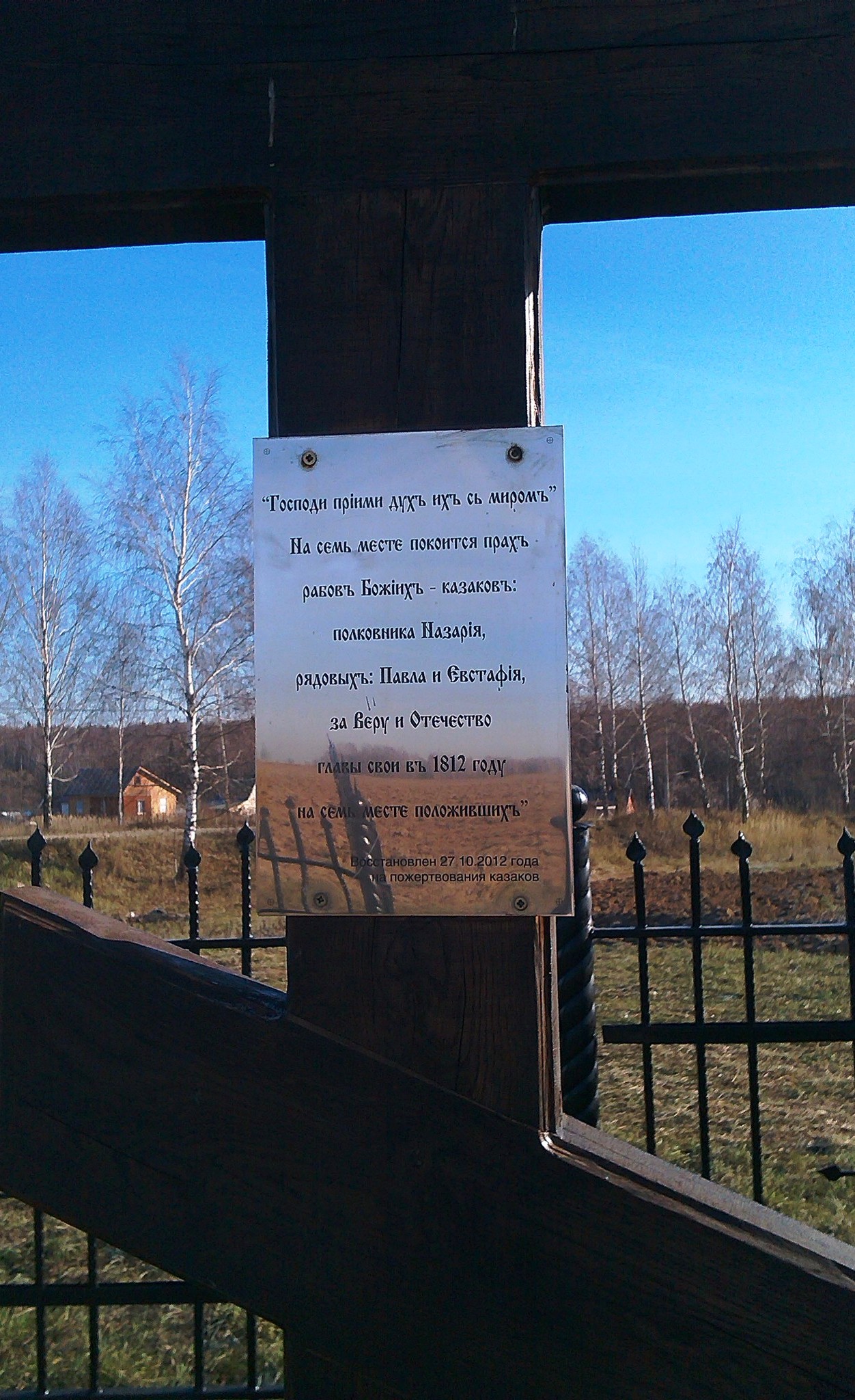 «Во вверенном мне уезде, близ деревни Колодези Никольской волости, около просёлочной дороги стоит деревянный крест. Подле него на столбе, на жестяном листе, имеется следующая надпись: «На сем месте покоится прах рабов божьих казаков: полковника Назария, рядовых Павла и Евстафия, за веру и отечество главы свои в 1812 году на сем месте положивших.