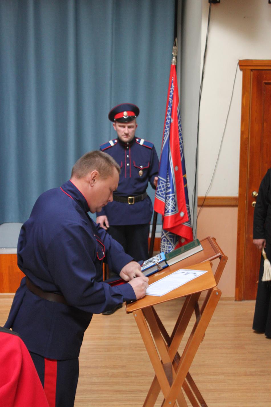 После построения и персонального зачитывания текста присяги казак целовал Крест и Святое Евангелие. Далее отец Олег окропил вновь прибывшего казака святой водой. В конце церемонии присягнувший казак припал на колено для целования знамени и торжественно произносил главные постулаты присяги: "Служу Отечеству, Казачеству и Вере Православной!"